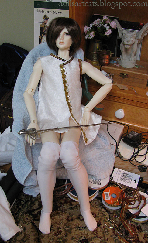 Still a long way to go... and I am not looking forward to the buttonholes. :o At least my doll now has stockings, with heels I had to stitch in by hand (they look very sloppy, it's a good thing they will be in shoes.)