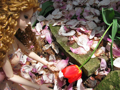 Had some torrential rain last night, and instantly got a carpet-o-petals this morning. Artemisia wants to know who will sweep it all up (it certainly won't be her). :D Also a casualty, the same tulips that had the snow piled on them--poor things!