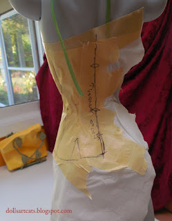 Once I cover the areas I want, I take a pen and mark where I will cut, and I make notes on what the different pieces go to, like Center Front, Center Back, Side etc.. Also I write what doll it is for :D